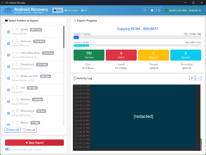 Start the export. If the device disconnects, just reconnect — recovery continues automatically.